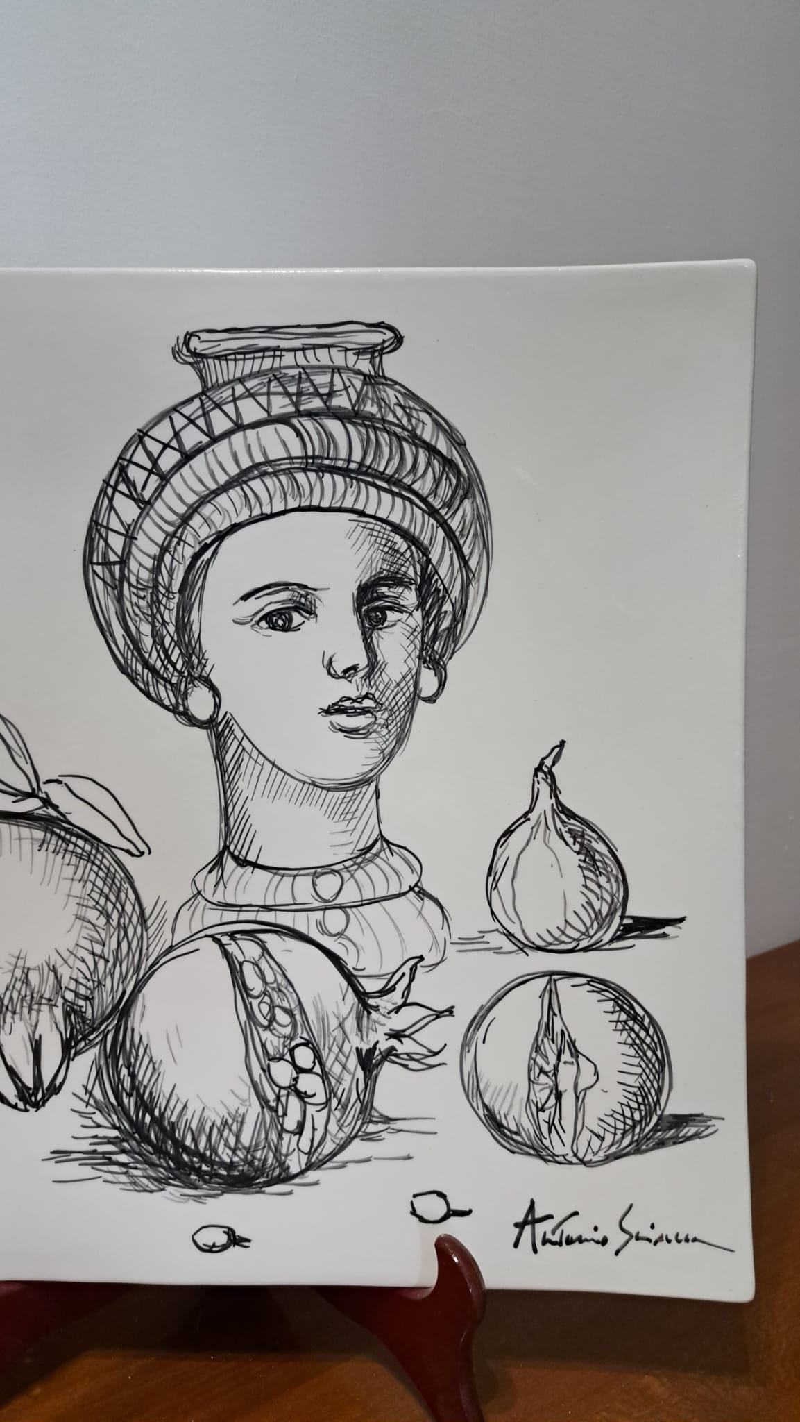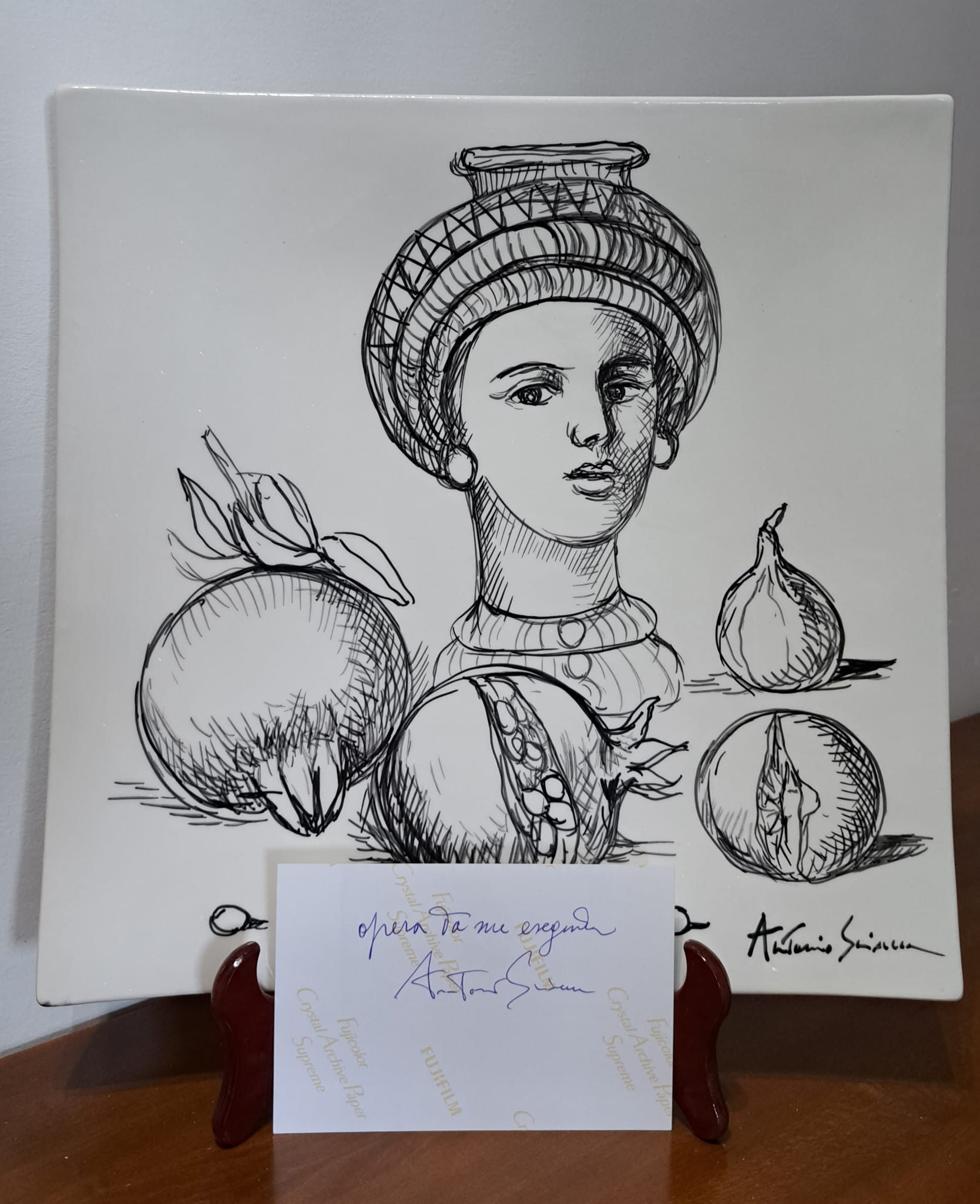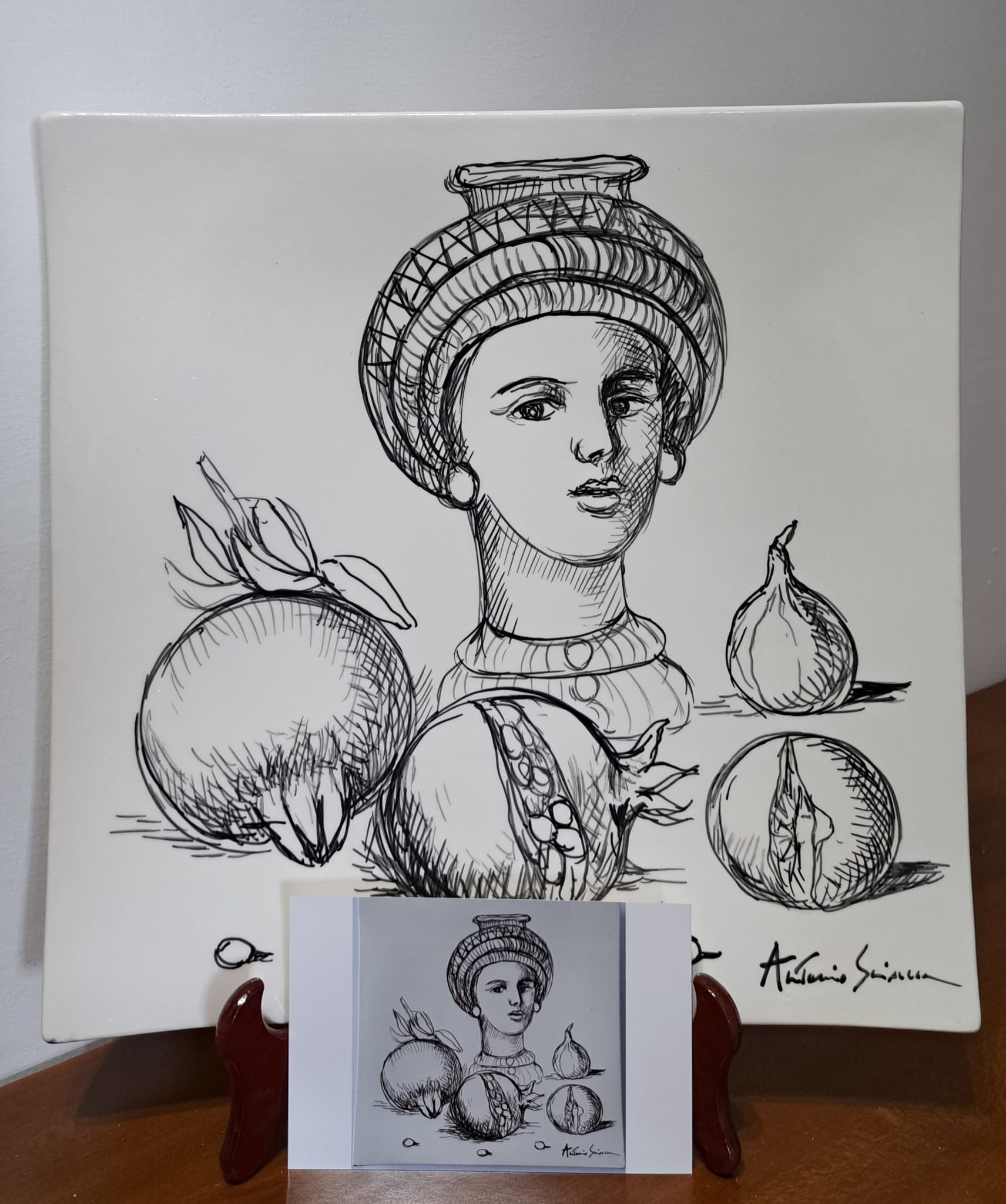 Anche il Maestro Antonio Sciacca ha l’opportunità di cimentarsi con questo antichissimo mezzo espressivo ed esplorare le possibilità che la ceramica offre. Dopo aver visitato diverse fabbriche di ceramica prima a Caltagirone e dopo a Deruta, ebbe l’idea di tracciare su fogli alcune idee con le quali si presentò da un artigiano ceramista deciso a trasformare le idee in prodotti. Questi lavori non sono casuali ma piuttosto il risultato di una riflessione e di una preparazione. In questo senso, il processo creativo è lo stesso seguito per i dipinti a partire dai disegni della variazione e della metamorfosi. Dipingere sulla ceramica non è come dipingere sul cavalletto: quando si dipinge su tela, su tavola, su carta, o comunque su di un supporto che è già pronto, si vedono i risultati in tempo reale. Con la ceramica funziona diversamente: i colori si vedono solo a cottura ultimata, pertanto il corretto bilanciamento della preparazione ( che appare di colore grigiastro ) , per Sciacca rappresenta anche una sorte di sfida. Lo stesso vale per la velocità con cui occorre portare a termine il lavoro perchè la ceramica come è noto ha proprietà assorbenti e per evitare che la preparazione asciughi troppo in fretta è necessario essere rapidi. Sciacca, per altro, sfrutta questa caratteristica a suo vantaggio, perchè in questo modo può conferire maggior tensione e dinamismo al soggetto raffigurato ( i suoi disegni sembrano quasi in movimento ). La ceramica è una delle forme d’arte più antiche che si conoscano: è una forma d’arte cosi antica e di cosi largo uso che Sciacca adatta anche per far arrivare l’arte contemporanea ad un pubblico più ambio.