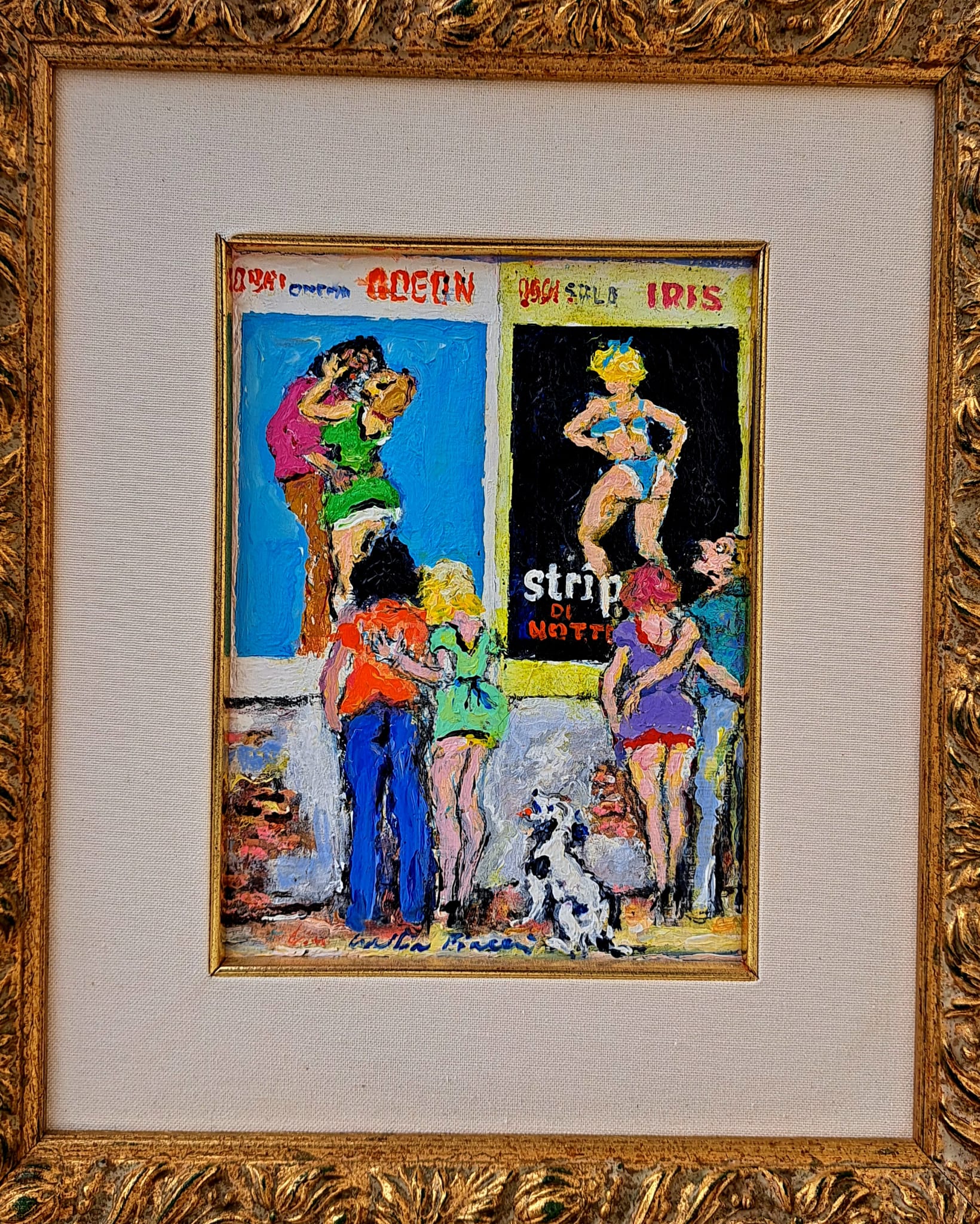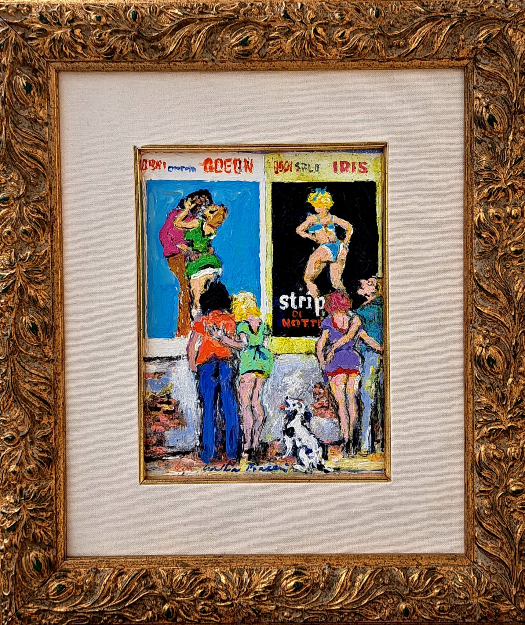 Opera unica di Walter Piacesi olio su tavola misura 20×30 cm titolo ” Pubblicità ” completa di autentica e archivio ufficiale  CA’ SPINELLO