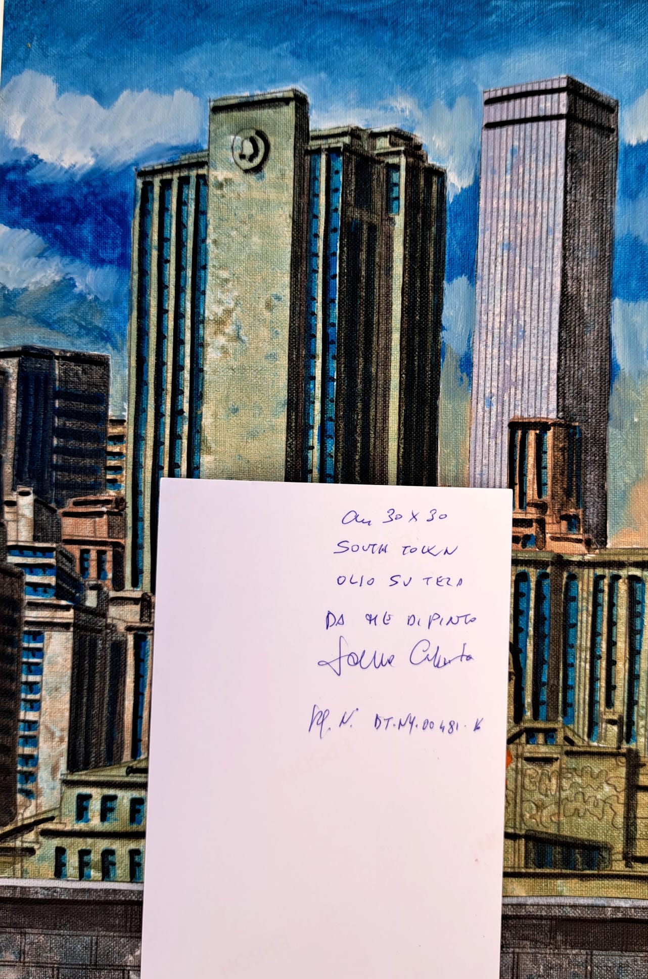 OPERA UNICA TECNICA OLIO SU TELA  CM 30X30 TITOLO SOUTH TOWN COMPLETA DI AUTENTICA CERTIFICATA